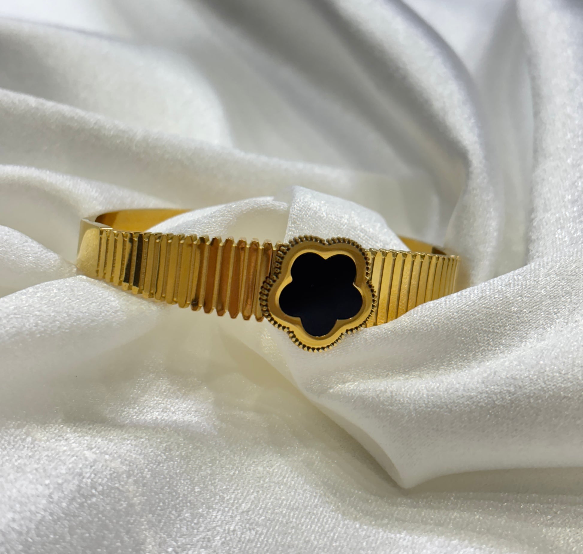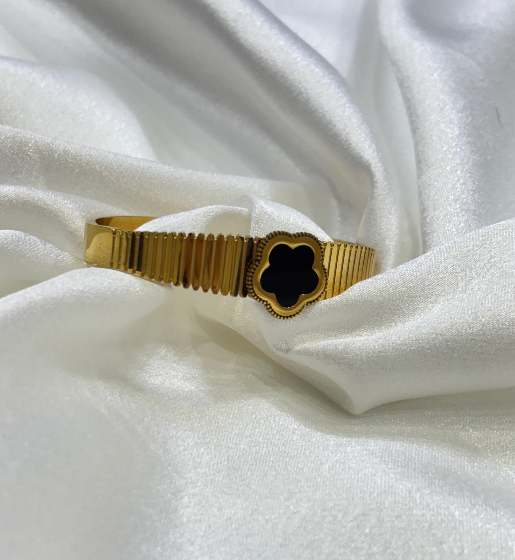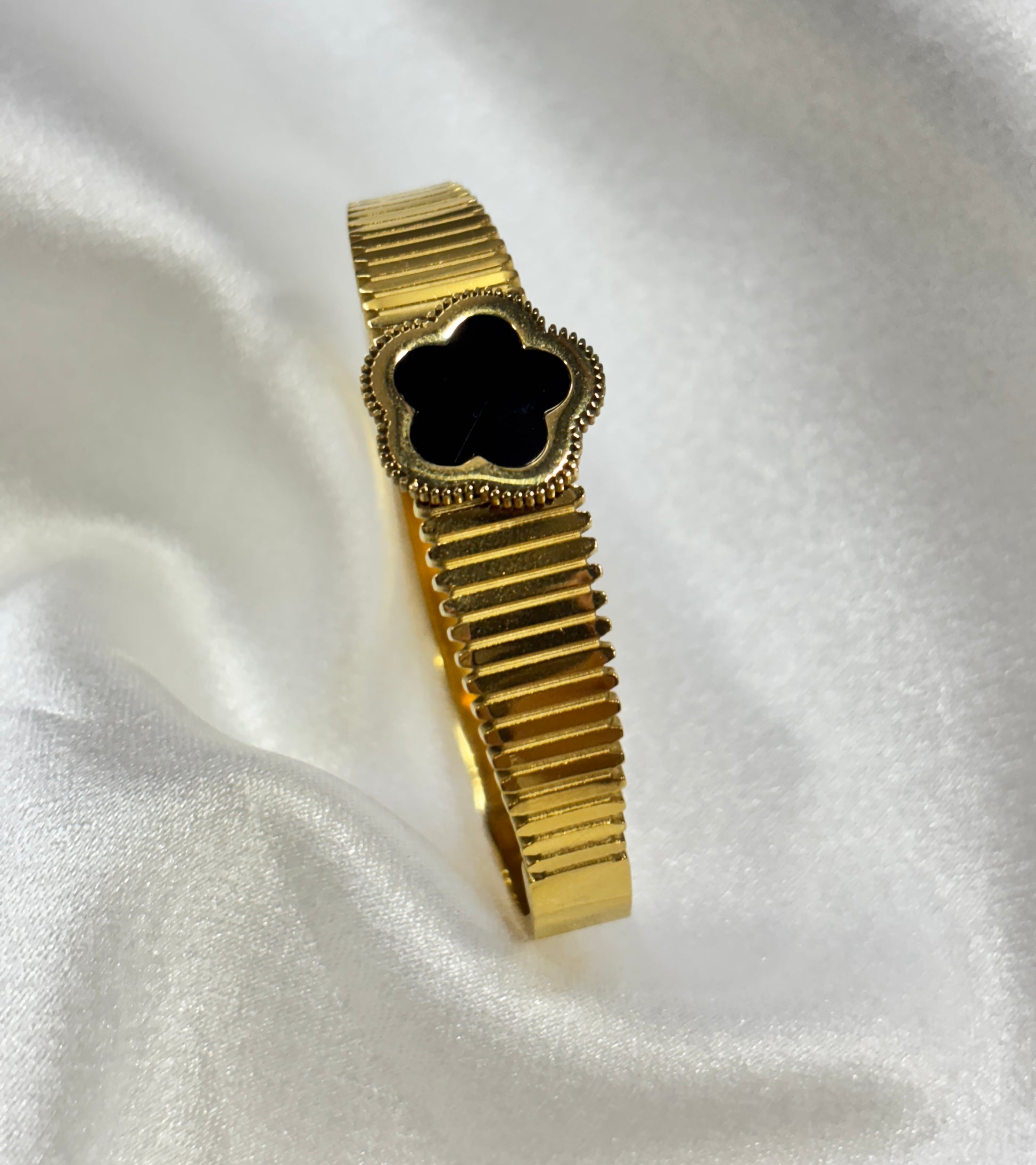 The Midnight Clover Bracelet brings together timeless elegance and symbolic charm. Designed with a luxurious ribbed gold band that wraps the wrist effortlessly, it offers both comfort and sophistication. At its center rests a black clover motif, framed with delicate beaded detailing—an emblem of luck, prosperity, and inner strength.